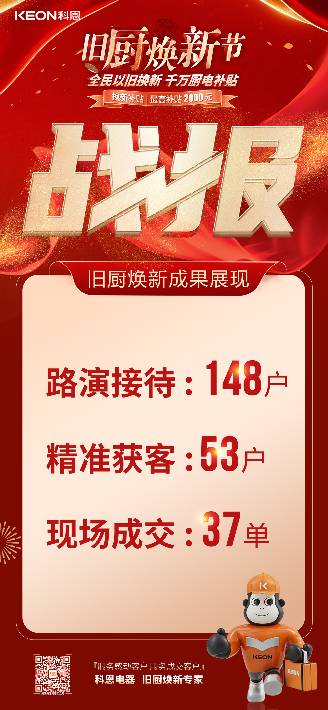 截止目前,科恩舊廚煥新路演活動在河南、河北、江蘇、安徽、湖南等部分城市開展,為期17天,各地陸續(xù)進行1-3天的路演,數(shù)據(jù)統(tǒng)計共接待148戶,精準獲客53戶,現(xiàn)場成交37單,轉(zhuǎn)化率達25%,取得佳績。通過政企補貼降低消費門檻,讓用戶現(xiàn)場體驗智能廚電升級價值,同時為經(jīng)銷商打造營銷樣板,推動行業(yè)綠色消費升級。