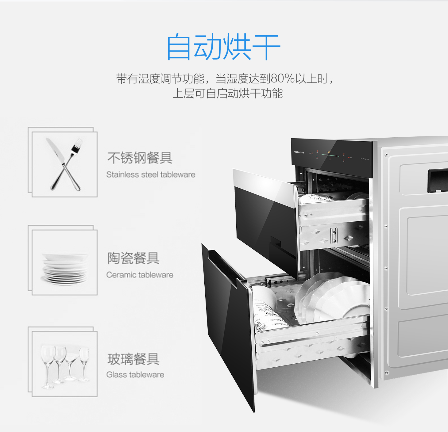 - 帶有濕度調(diào)節(jié)功能,當(dāng)濕度達(dá)到80%以上時(shí),上層可自啟動(dòng)烘干功能。