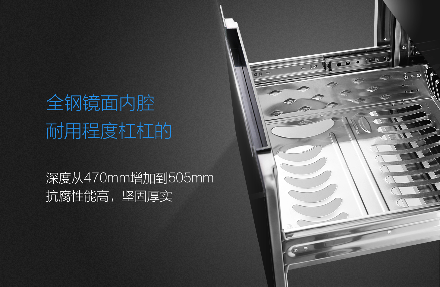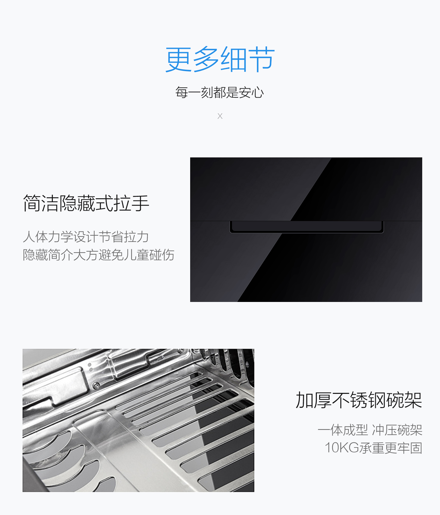 - 不銹鋼一體成型碗架,外置滑軌,推拉順暢不搖晃。