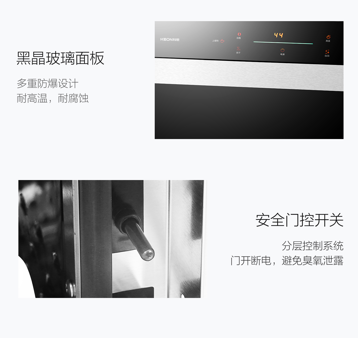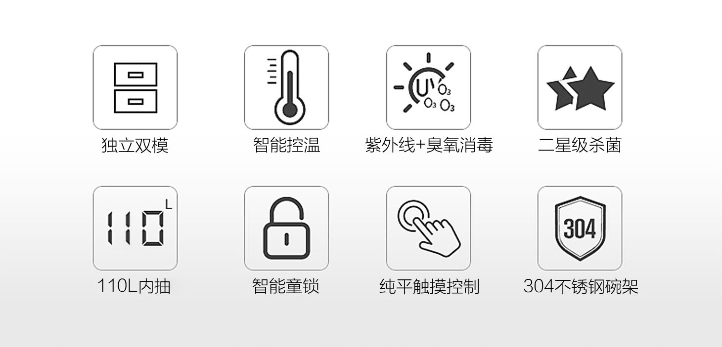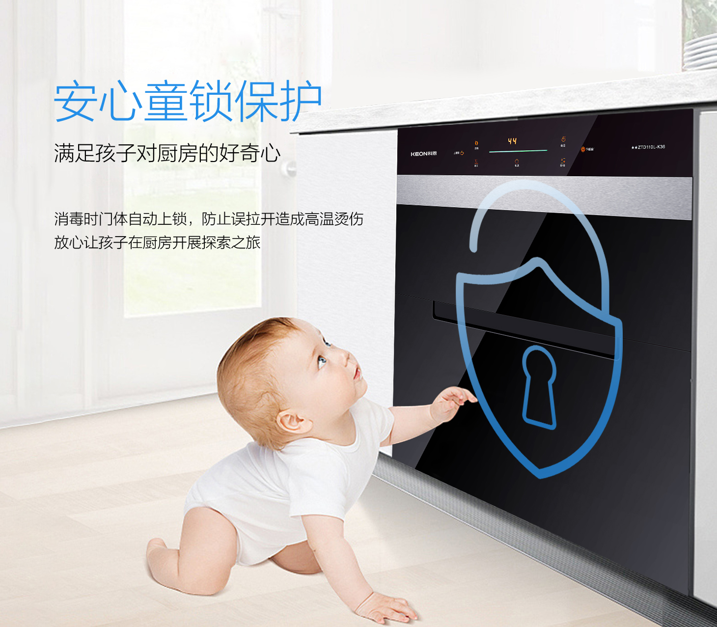 - 安心童鎖保護(hù),消毒時(shí)門體自動(dòng)上鎖,防止誤拉開造成高溫燙傷。
