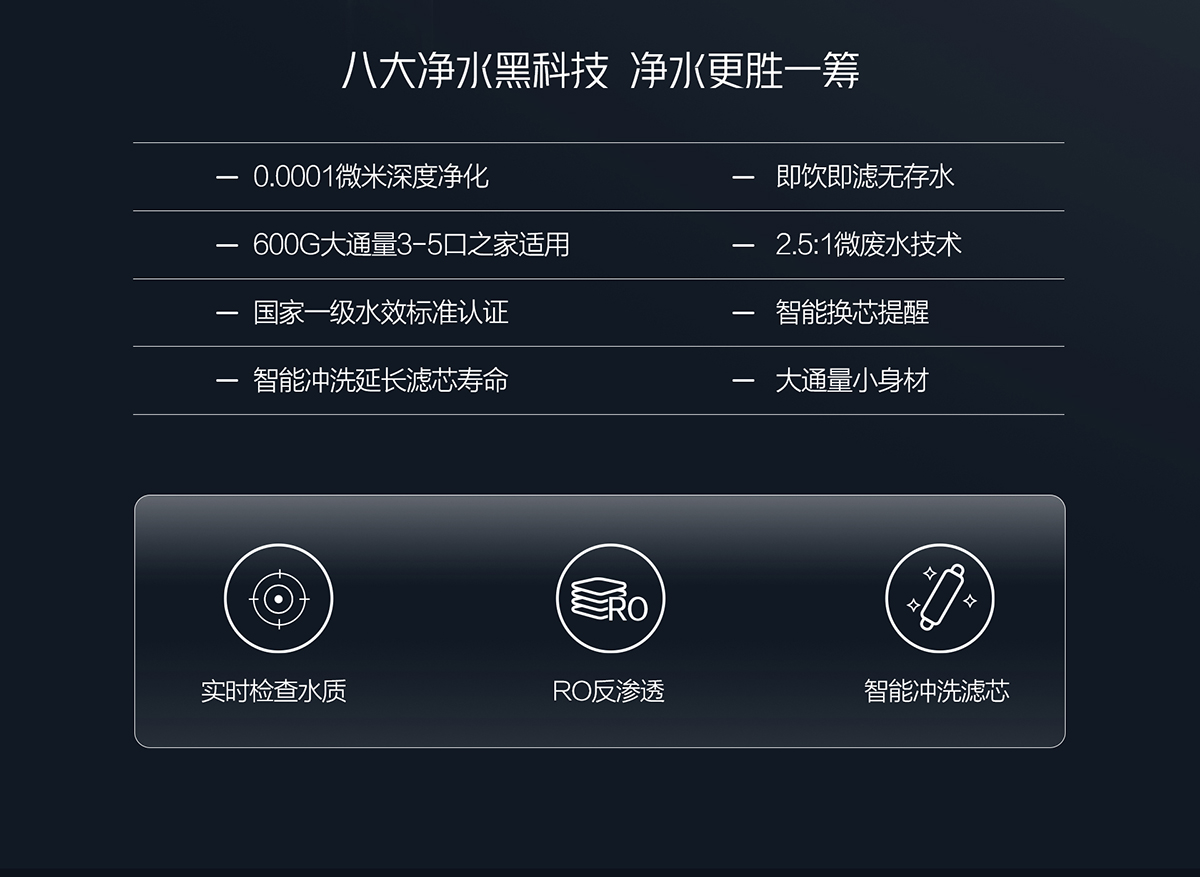 - 5年RO長效續(xù)航,高精度反滲透濾芯
