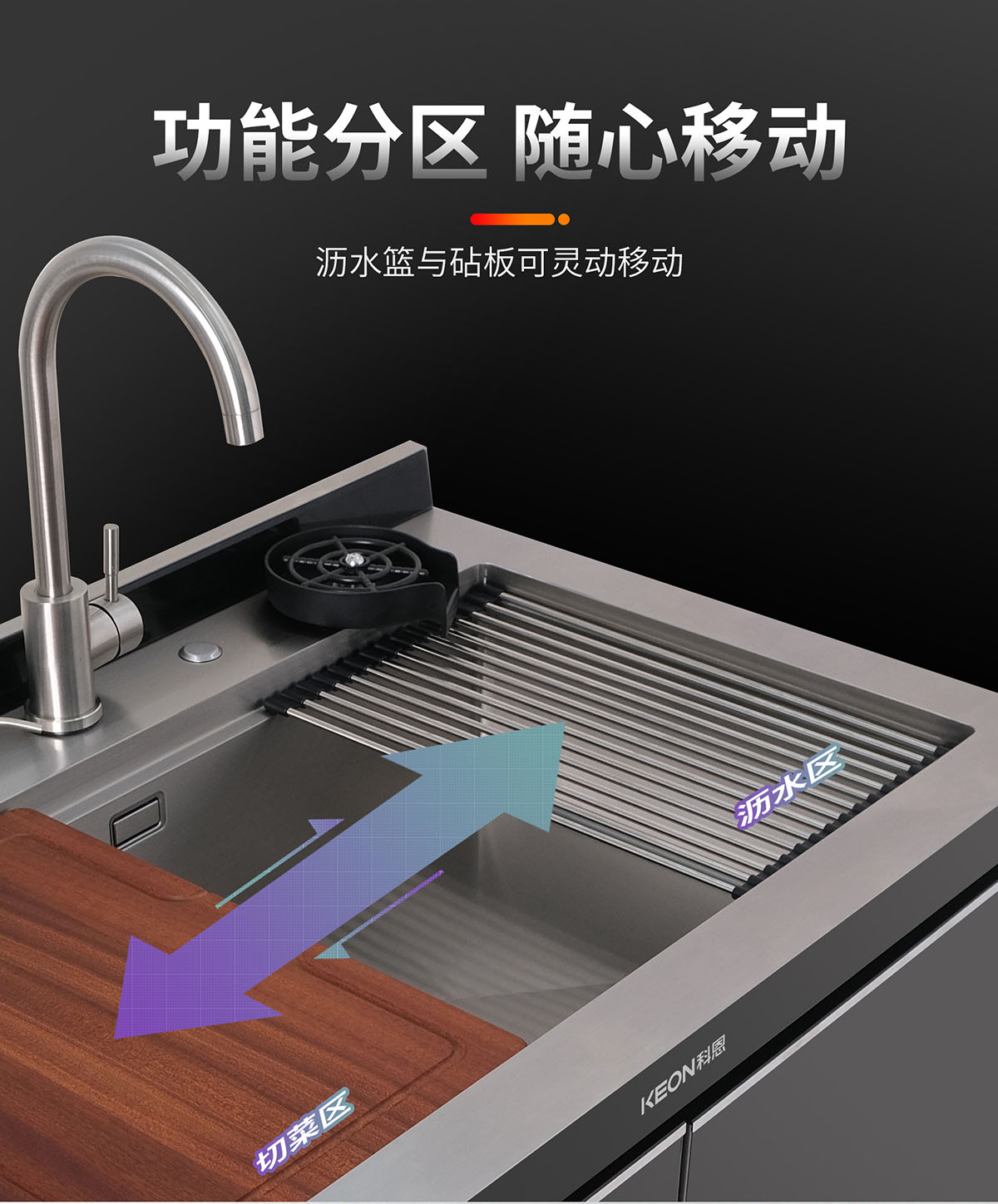 - 瀝水籃與砧板可靈動移動,功能分區(qū),隨心移動
